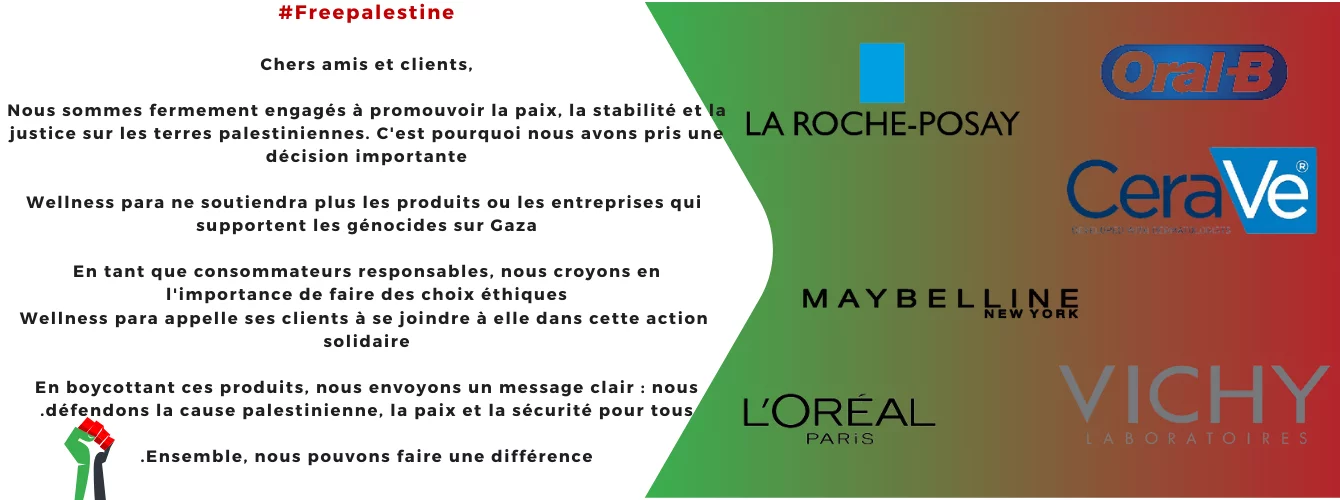 Wellness parapharmacie est une entreprise spécialisée dans le domaine de la santé et du bien-être. Nous nous engageons à offrir une large gamme de produits parapharmaceutiques de haute qualité, ainsi que des conseils d'experts pour aider nos clients à atteindre leurs objectifs de santé et de beauté. Nous croyons fermement que le bien-être est essentiel pour une vie épanouissante, et nous nous efforçons de fournir des solutions adaptées à chacun de nos clients. Services : Vaste sélection de produits : Nous proposons une large gamme de produits parapharmaceutiques, allant des soins de la peau et des cheveux aux vitamines et compléments alimentaires, en passant par les produits pour bébés et la santé naturelle. Nos produits sont soigneusement sélectionnés auprès de marques réputées pour garantir leur qualité et leur efficacité.